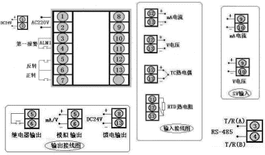 外給定控制,通訊方式RS232,輸出方式繼電器輸出,PV輸入類型為Pt100,SV輸入類型為4~20 mA,D一報警為上限報警,D二報警為下限報警,DC24V饋電輸出,供電方式為直流24V供電。